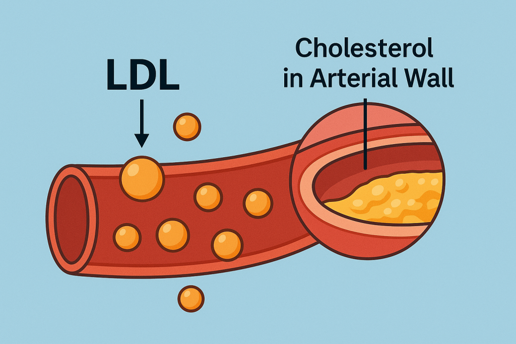 Illustration of an artery with plaque buildup (cholesterol deposits). Excess LDL (“bad” cholesterol) leads to plaque formation that narrows arteries (atherosclerosis), increasing the risk of heart attacks and strokes . HDL (“good” cholesterol) helps remove cholesterol from plaques, slowing or reversing this process.