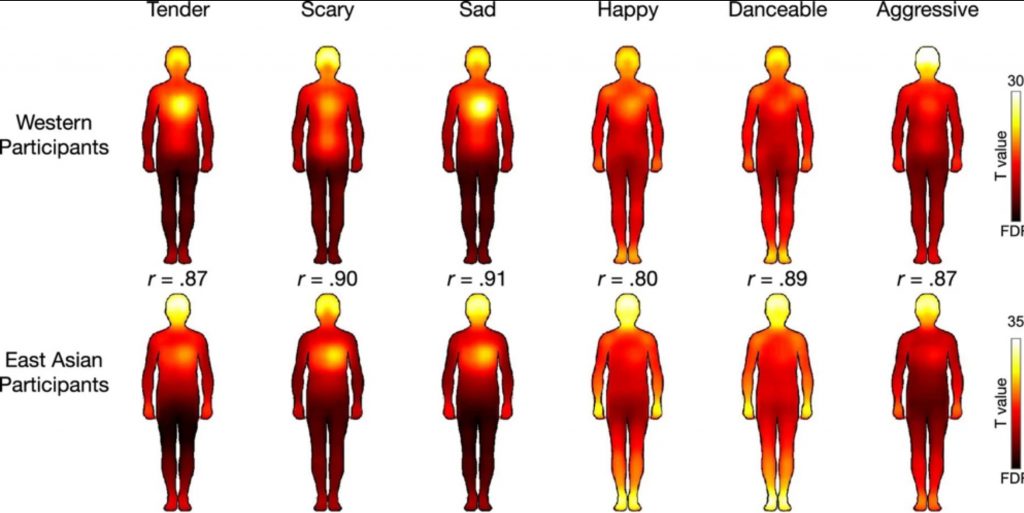 People from different cultures experience similar patterns of bodily sensations in response to music. In one study, Western and East Asian participants indicated where they felt various emotions from music in their bodies. Warm colors (yellow/white) show regions of increased sensation. Both groups felt upbeat “happy” or “danceable” music as energizing nearly everywhere (notably in the limbs), while “sad” or “tender” songs were felt more in the head and chest. The strong similarity (high correlation r values) between cultures suggests universal physiological responses to musical emotions  .