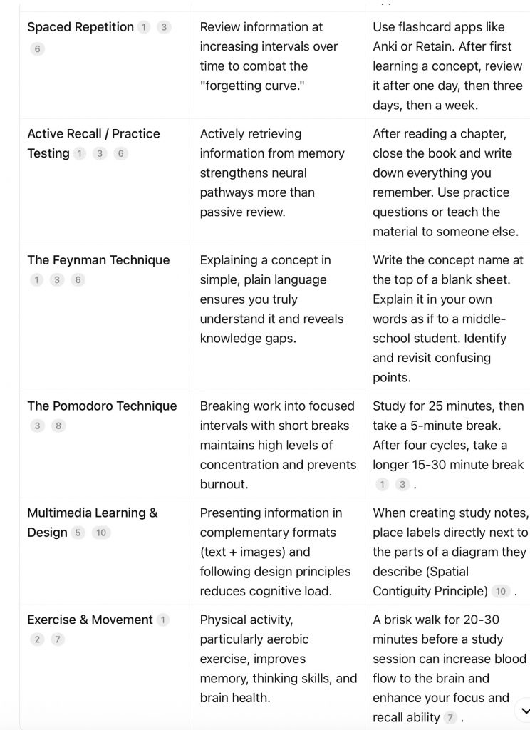 · Start Small and Experiment: Don’t try to implement everything at once. Choose one or two techniques from the table that resonate with you. You might start with the Pomodoro Technique to build your focus stamina and incorporate Active Recall in your next study session by using flashcards.