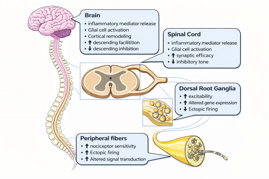 To “feel pain” is not one event. It is a relay race that starts in the body and ends in conscious experience.